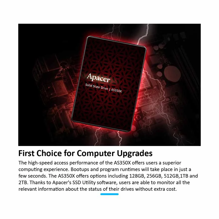 The AS350X is the perfect choice for computer upgrades, available in capacities of 128GB, 256GB, 512GB, 1TB, and 2TB. With Apacer’s SSD Utility software, users can effortlessly monitor drive status and health, ensuring optimal performance without any additional cost.