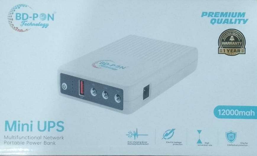 The BD-PON Mini UPS 12000mAh (5V/9V/12V) is a compact and versatile power backup solution designed for homes, offices, and businesses that demand reliable, uninterrupted power for critical devices. With features like 12000mAh high-capacity battery , multi-voltage output (5V/9V/12V) , portable design , long-lasting performance , and 1-year warranty , this mini UPS empowers users to protect their devices from power outages and ensure seamless operation. Whether you’re safeguarding your Wi-Fi router, security cameras, or other essential electronics, the BD-PON Mini UPS provides everything you need to stay powered and connected. Available exclusively at Best Computer Hub , this solution is your gateway to unlocking dependable power backup tailored for modern lifestyles.