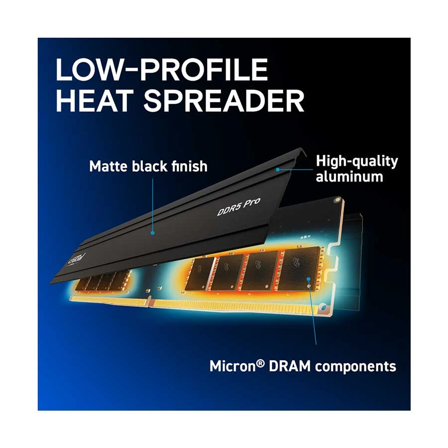 Crucial Pro DDR5 is tailored for gamers seeking high performance without the complications of tuning latencies or chasing LEDs. Its sleek black heatsink design enhances both aesthetics and thermal efficiency, ensuring your system runs cooler and more efficiently, even during intense gaming sessions.