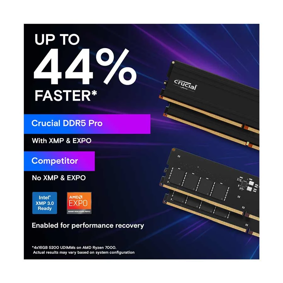 Crucial Pro DDR5 supports both Intel® XMP 3.0 and AMD EXPO™, enabling easy performance recovery on CPUs that throttle rated memory speeds. By adjusting settings in the UEFI/BIOS, you can unlock your system’s full potential without overpaying for unnecessary features.