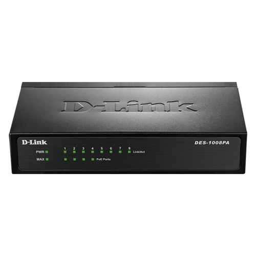 The D-Link DES-1008P 8-Port enables both home and office users to connect and supply power to Power over Ethernet (PoE) devices such as wireless access points (APs), IP cameras, and IP phones. Additionally, it allows you to add more Ethernet devices like computers, printers, and Network Attached Storage (NAS) to your network. This compact PoE switch is designed with home and small business users in mind, ensuring quiet operation.