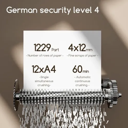 The shredder comes with a modern touch panel interface that enhances user experience through simple, intuitive controls. The auto start/stop function adds convenience, activating the shredder when paper is inserted and stopping when the shredding is complete.