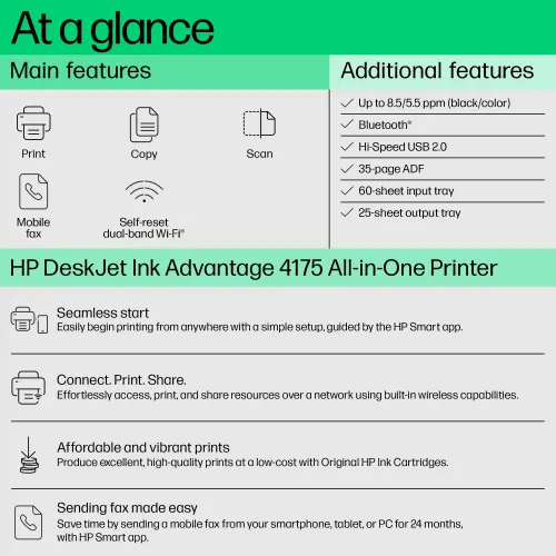 The HP Ink Advantage 4175 All-in-One Multifunction Printer is a budget-friendly wireless and USB printer that combines functionality with security, making it an ideal choice for both home and office environments. This compact inkjet printer is designed to print, copy, and scan efficiently, saving both space and money. Its 35-page Automatic Document Feeder (ADF) allows for fast, hands-free operation, enabling you to complete scanning and copying tasks quickly.