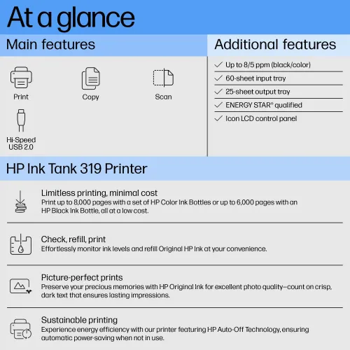 Navigating the HP Ink Tank 319’s features is simple with its intuitive, user-friendly controls. Easily connect to your devices via High-speed USB 2.0, enabling seamless printing from your computer, smartphone, or tablet.