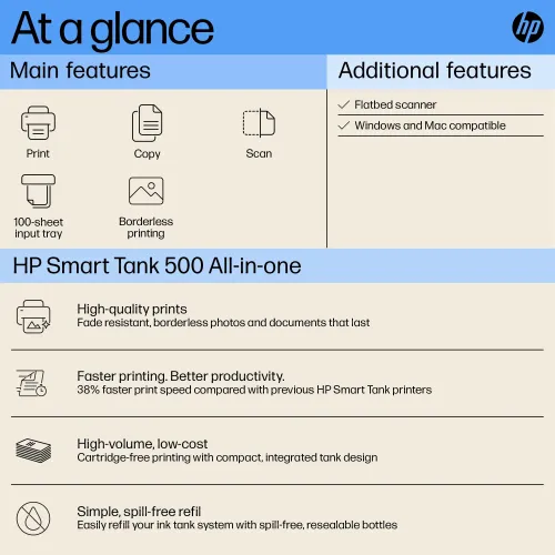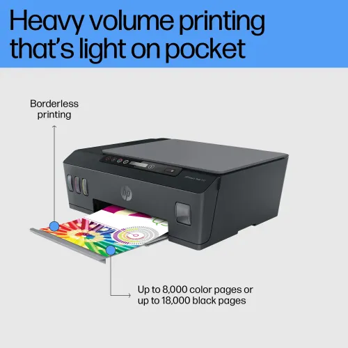 Designed for high-volume needs, the HP Smart Tank 500 prints up to 18,000 black pages or 8,000 color pages on a single refill, eliminating the hassle of frequent ink replacements. From reports to vibrant photos, enjoy continuous productivity without interruptions.