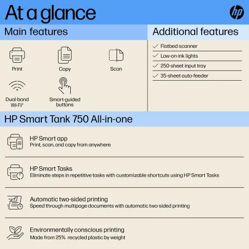 The HP Smart Tank 750 All-in-One Printer combines performance, sustainability, and convenience, making it an ideal solution for modern, eco-conscious users.