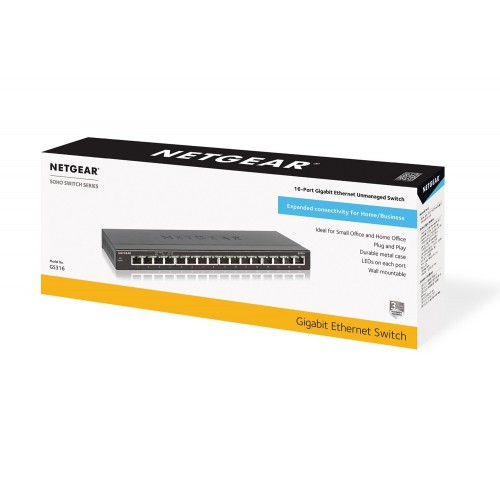 The Netgear GS316 16-Port Gigabit Ethernet Desktop Switch is an essential networking device designed to provide seamless connectivity for small offices and home networks. With 16 auto-sensing Gigabit Ethernet ports, this switch ensures high-speed, reliable data transfer across your network, making it ideal for businesses, home offices, or anyone requiring a robust and efficient network solution.