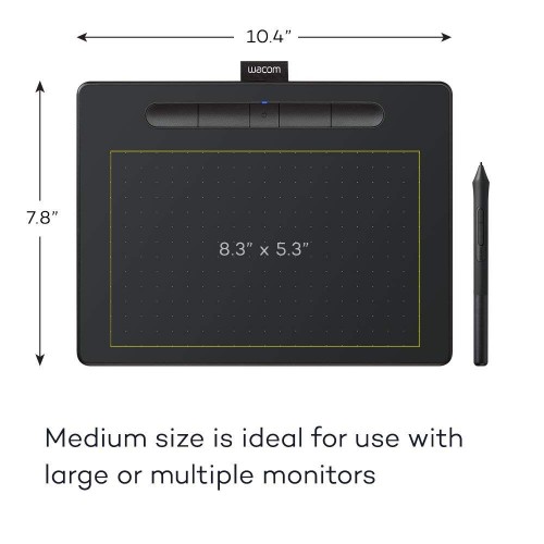 With overall dimensions of 26.4 x 20 x 0.9 cm and an active drawing area of 8.5 x 5.3 inches, the Wacom CTL-6100WL/K0-CX Intuos Medium Bluetooth Pen Graphics Tablet provides a comfortable canvas for detailed work. The compact form factor also makes it an excellent choice for users with large or multiple monitors, allowing smooth transitions between screens and generous space for freehand drawing.